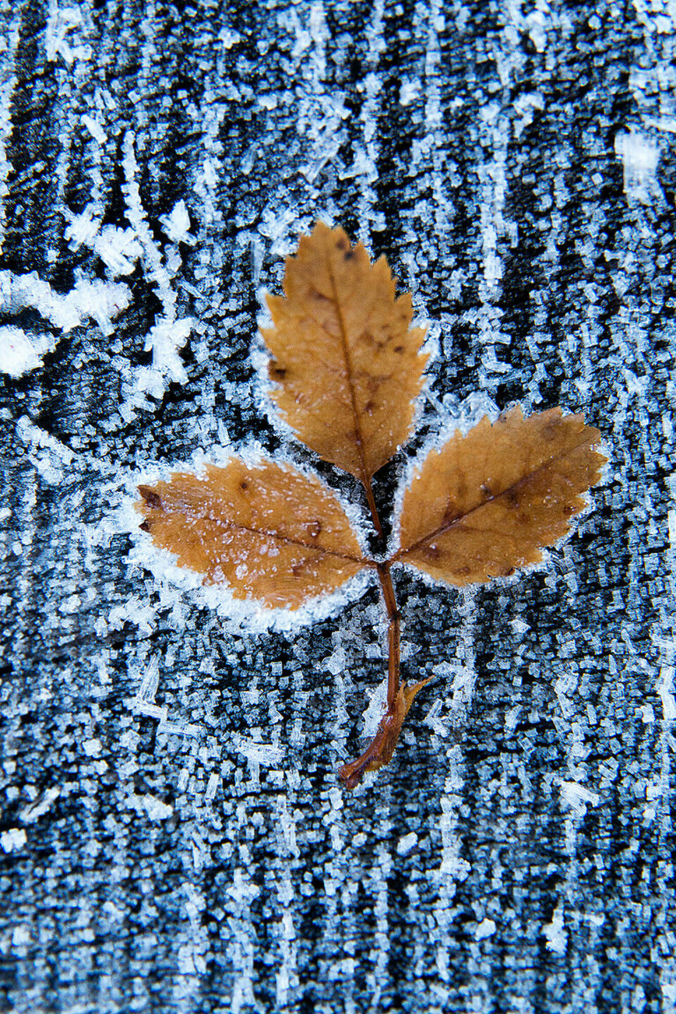 Una fría mañana de invierno me entretuve buscando por el suelo hojas peculiares que aún tuvieran escarcha con la idea de hacer una serie, como fondo utilicé las mismas piedras o ramas que había en el entorno. Fotografiada a pulso con Canon EOS 70D y focal 85mm, con los siguientes parámetros ISO 640, f7,1 y 1/80 seg.